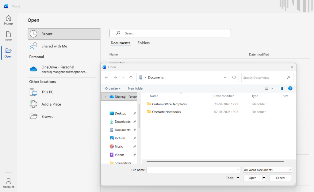 1. Open the MS Word app and click on Open.