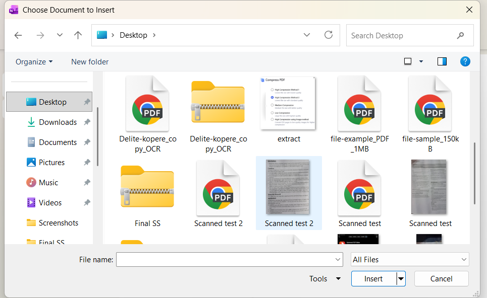 6. Locate the scanned PDF on your PC and insert it into the OneNote app.