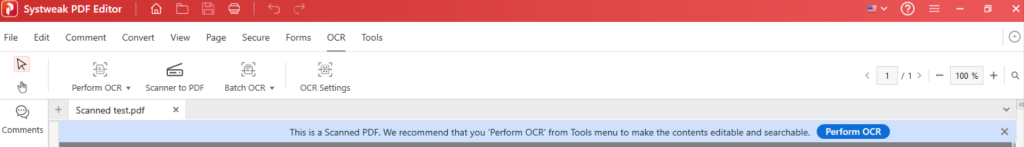 5. The Systweak PDF Editor will detect if the PDF requires OCR, load the PDF within the app and provide the button to perform OCR.