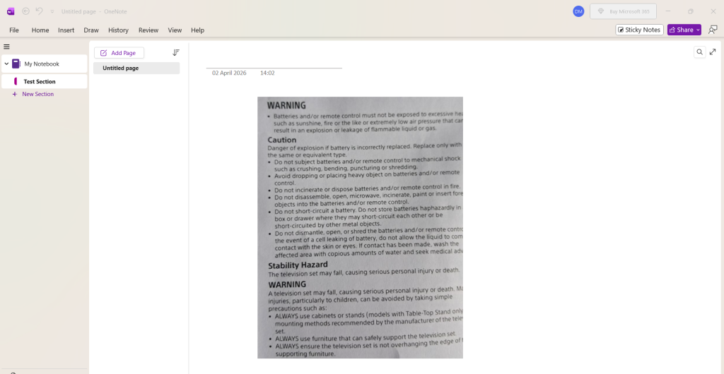 7. The PDF file will now be loaded as an image into the OneNote app.