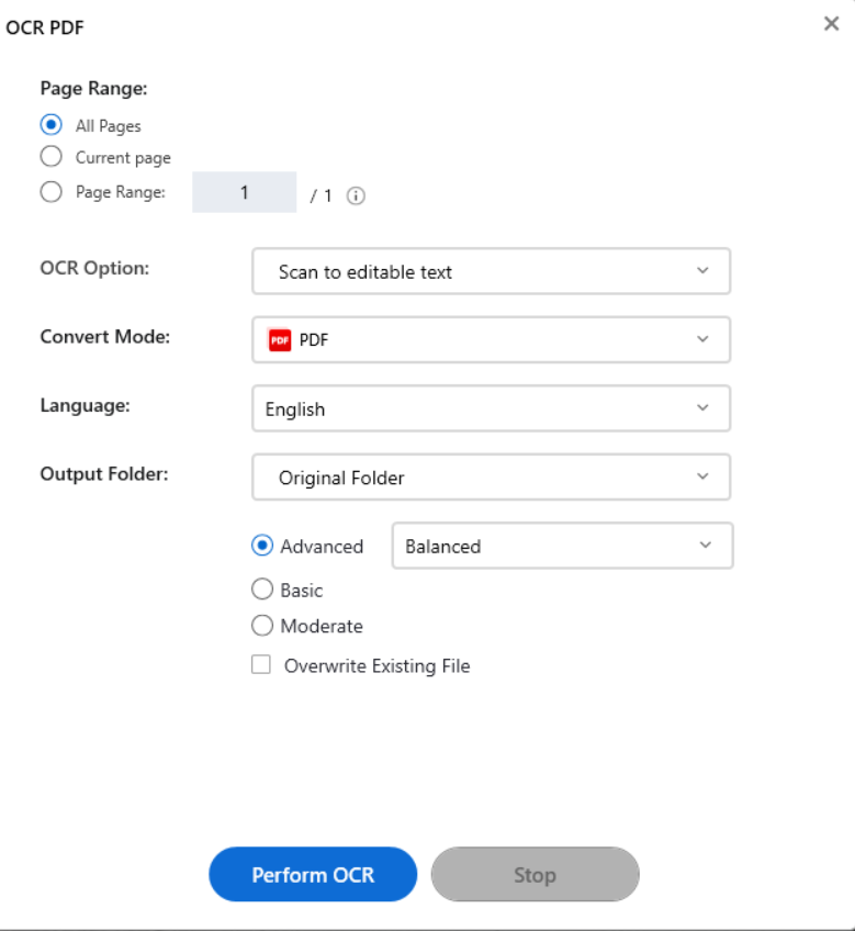 3. Click on the Perform OCR button and choose OCR from PDF.